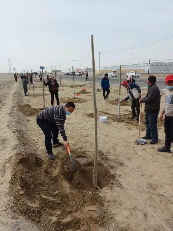 活動現場,新疆林學會秘書長安尼瓦爾·阿木提同志帶領學會工作人員,與當地干部群眾共同栽植下一株株健碩的樹苗,培土澆水,對樹干涂白。連片的幼樹如列兵般筆直工整,抵御干旱風沙的侵襲,守護著當地的生態環境。