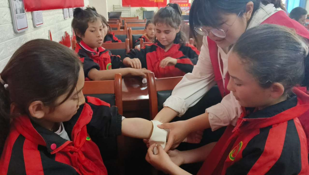 實踐團隊成員對鄉(xiāng)村中小學生開展CPR急救、海姆立克急救和止血包扎知識的講解和操作訓練,楊雯麗、郭欣格兩位同學詳細地介紹并演示了心肺復蘇的操作過程,并對有疑問的孩子進行一對一的講解和指導,使同學們掌握最具有實用基礎的急救方法。