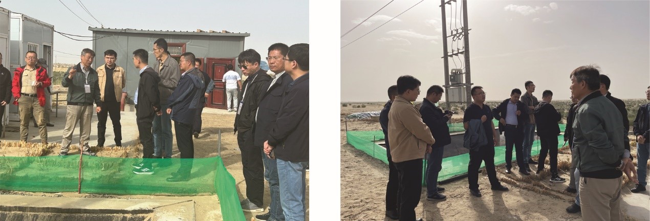 10月10日,參會人員針對塔克拉瑪干沙漠北緣阻擊戰沙雅模式進行了實地勘察。在沙雅縣光伏咸水治沙現場,沙雅縣林草局王開彥局長向與會專家介紹了沙雅縣光伏+咸水的治沙模式已取得的成績和面臨的挑戰,并向各位專家介紹了當前和今后一個時期沙雅縣關于光伏+咸水戰略布局??辈飕F場,來自中國地質調查局西安地質調查中心的張俊研究員專門針對沙漠北緣的水循環過程、咸水補給方式和時空演變規律與各位專家進行了交流與討論。雷加強研究員專門針對沙雅縣光伏+咸水的典型模式進行了解讀,認為這種模式具有低成本、高效率和靈活性強的特征,一旦大面積推廣應用,將成為解決塔克拉瑪干沙漠邊緣阻擊戰生態用水缺口的有效途徑。此外,來自企業的專家針對光伏+咸水裝置的成本問題進行了討論。