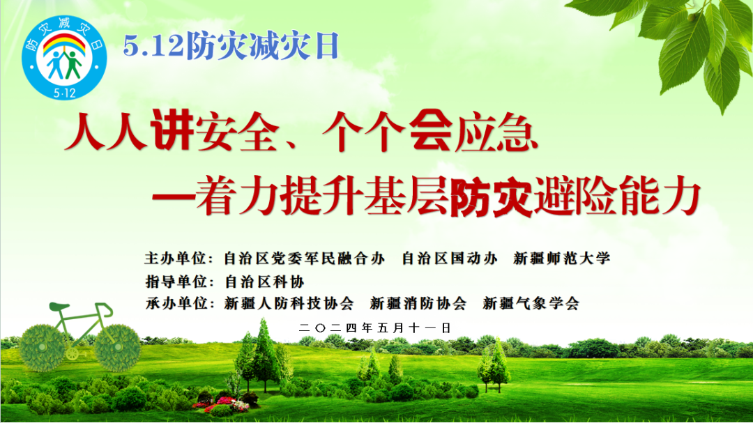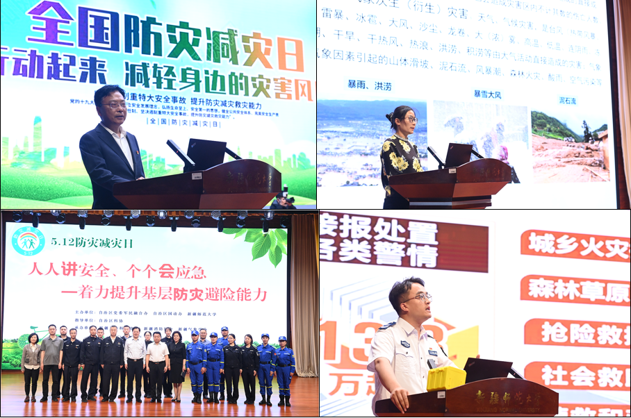 5月11日上午,自治區(qū)黨委軍民融合辦、自治區(qū)國動(dòng)辦聯(lián)合新疆師范大學(xué)、新疆人防協(xié)會(huì)、新疆消防協(xié)會(huì)、新疆氣象學(xué)會(huì),在新疆師范大學(xué)溫泉校區(qū)舉辦了以“人人講安全、個(gè)個(gè)會(huì)應(yīng)急——著力提升基層防災(zāi)避險(xiǎn)能力”為主題的“5·12”防災(zāi)減災(zāi)日宣傳活動(dòng)。