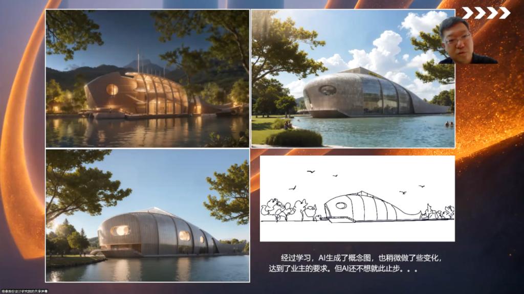 本次講堂主要圍繞“AIGC技術及開展AI設計研究時間歷程”、“AIGC應用時間案例”、“AIGC未來的發展方向”三大部分內容展開。據不完全統計,2023年中國生成式AI市場規模約為14.4萬億元,預計到2035年將突破30萬億元,占全球總市場規模超過35%,隨著AI技術的不斷發展,中國生成式AI應用目前集中于商業化發展成熟的優勢產業,如電商、傳媒、娛樂和游戲等,這些領域利用AI技術實現了快速發展和數字化轉型。而在近幾年AI技術也開始在建筑設計領域逐漸嶄露頭角,如輔助方案創作與概念生成、智能高精度渲染、智能設備布置、智能管線排布、成本預測與風險緩解等方面,涵蓋了從方案創作到施工圖設計等多個方面,推動建筑設計領域的創新和發展。高永峰老師著重通過對“控制性實踐”、“發散性實踐”、“室內方案實踐”講述AI技術在方案設計領域所做出的貢獻,憑借靈感手繪、實際生活中物品形狀、折紙形狀等初始狀態借助AI技術呈現出最終的建筑形態、室內裝修效果、城市更新效果、方案比選等。