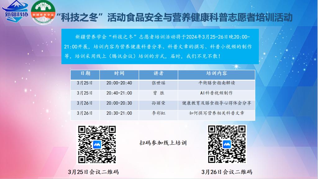 此次活動共招募涵蓋臨床醫(yī)師、公衛(wèi)醫(yī)師、營養(yǎng)醫(yī)師、護士、高校及中學(xué)教師、在校大學(xué)生、在校研究生等來自全疆各地的112名志愿者,先后在2024年3月25-26日,圍繞平衡膳食指南解讀、Al科普視頻制作、健康教育及膳食指導(dǎo)心得體會分享、如何撰寫營養(yǎng)相關(guān)科普文章等內(nèi)容,以線上(騰訊會議)培訓(xùn)的方式開展。志愿者反饋培訓(xùn)內(nèi)容“干貨滿滿、接地氣”、獲益匪淺。