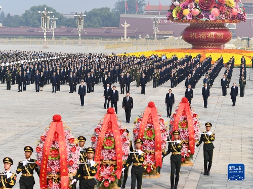 臨近10時,習近平、李克強、栗戰書、汪洋、王滬寧、趙樂際、韓正、王岐山等黨和國家領導人來到天安門廣場,出席向人民英雄敬獻花籃儀式。