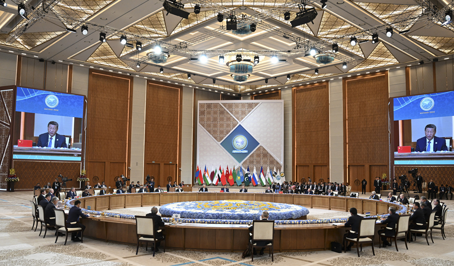 當(dāng)?shù)貢r(shí)間7月4日上午,國(guó)家主席習(xí)近平在阿斯塔納獨(dú)立宮出席上海合作組織成員國(guó)元首理事會(huì)第二十四次會(huì)議。新華社記者 謝環(huán)馳 攝