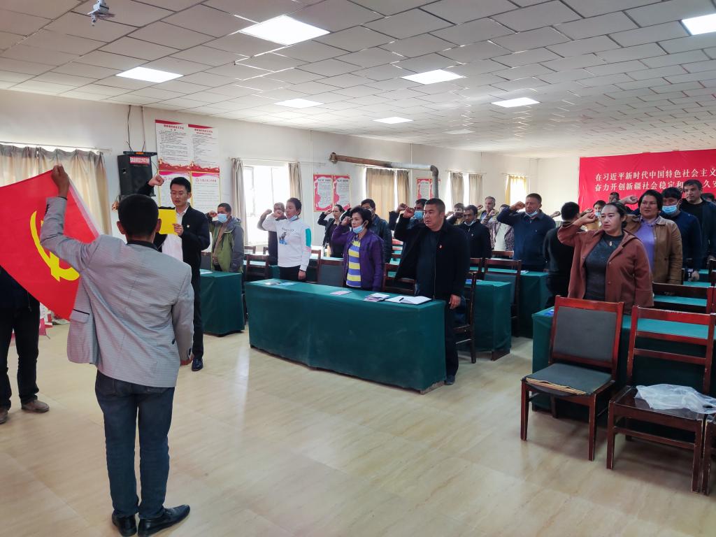 活動現場,夏央村全體黨員面對神圣的黨旗,重溫入黨誓詞。“我志愿加入中國共產黨,擁護黨的綱領,遵守黨的章程,履行黨員義務……”一句句鏗鏘有力的誓詞,激發起黨員干部在回望黨的光輝歷程中奮進新征程的昂揚斗志。看似簡簡單單的重溫入黨誓詞,卻有著不同尋常的意義。“站在黨旗下宣誓,就不僅僅是在讀幾句誓詞,而是在向黨作出承諾,今后我將以更加飽滿的熱情投入到為群眾服務的工作中。”夏央村黨支部書記艾斯凱爾·麥提托合提說。