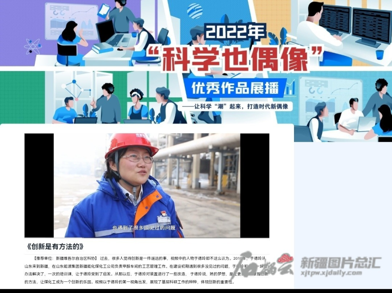 新疆5部獲獎(jiǎng)作品包括:中國(guó)石油新疆油田公司勘探開(kāi)發(fā)研究院趙龍作品《滾滾油流涓涓愛(ài)——覃建華科技報(bào)國(guó)事跡短片》(二等獎(jiǎng));新疆氣象學(xué)會(huì)、新疆氣象服務(wù)中心伊力哈木作品《綠色生態(tài)工匠——毛煒嶧》(三等獎(jiǎng));新疆植物學(xué)會(huì)康曉珊作品《科研工作者的生命永遠(yuǎn)年輕》 、新疆維吾爾自治區(qū)中藥民族藥研究所趙亞琴作品《邊疆中藥人——李曉瑾團(tuán)隊(duì)》、山東能源集團(tuán)新疆能化公司李響作品《創(chuàng)新是有方法的》(優(yōu)秀視頻)。