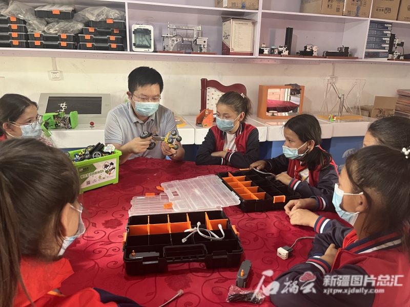 國慶假期,盛凱為民豐縣安迪爾鄉繁榮村的孩子們輔導機器人拼裝。曲聞博攝