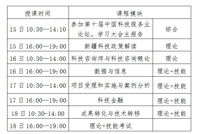 七、考試要求及方式:培訓期間學員必須完成科技咨詢師公共服務平臺每日打卡,方可進入考試模式;采用線上系統考試,學員請務必攜帶筆記本電腦。