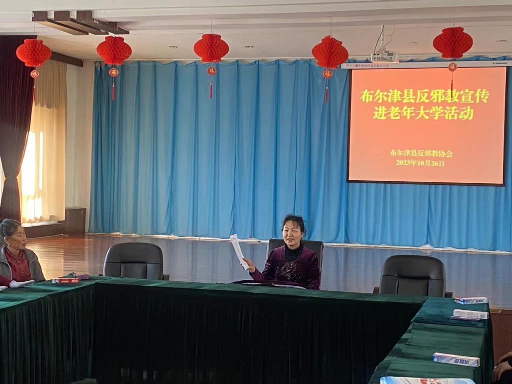 為進一步深化反邪教工作,營造濃厚的反邪、防邪社會氛圍,提高老年人防范意識,10月26日,布爾津縣反邪教協會和阿勒泰地區老年大學布爾津縣教學點聯合開展以“崇尚科學 反對邪教”為主題的反邪教知識進校園宣傳活動。