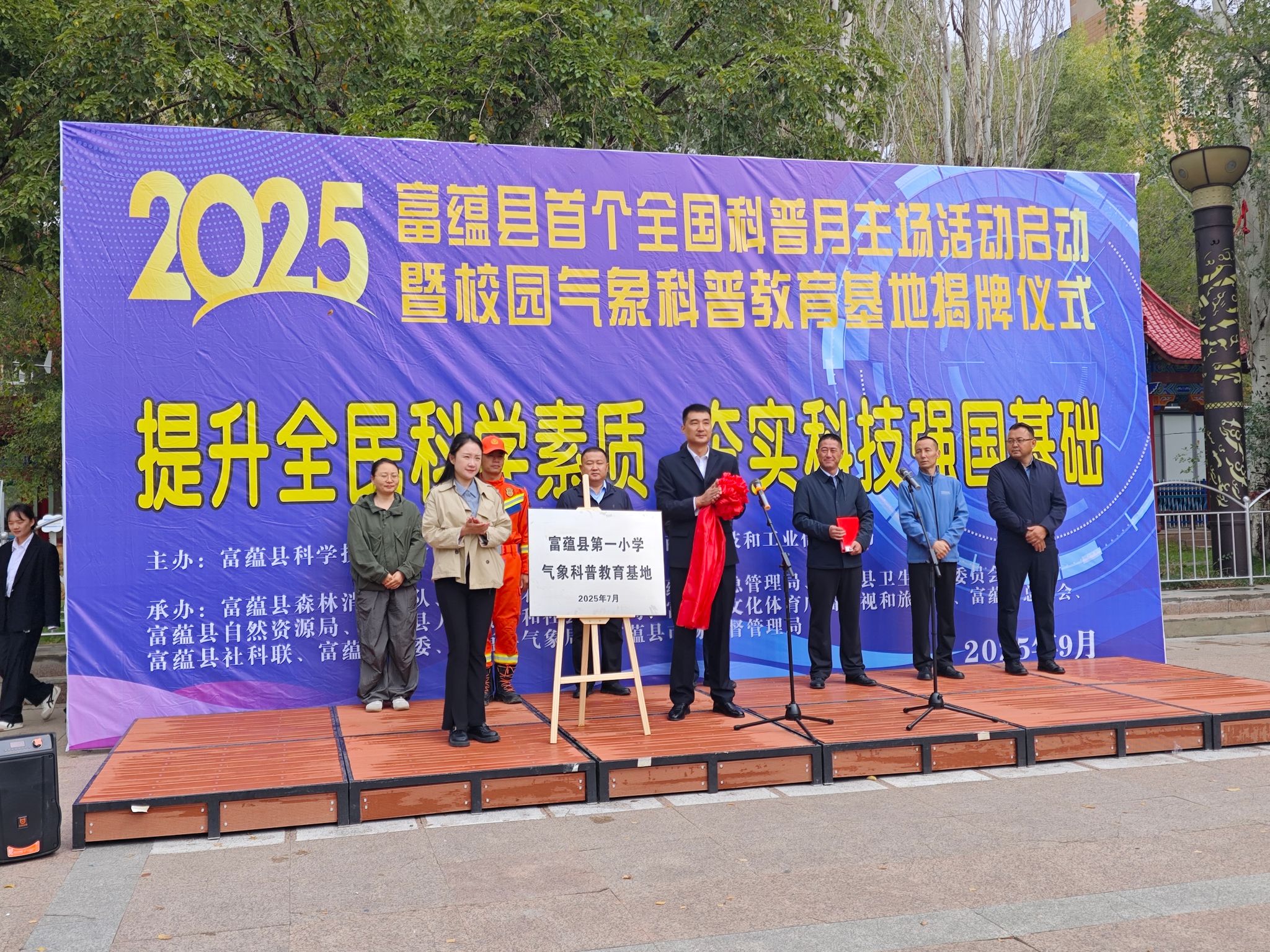 啟動儀式上,富蘊縣政府相關領導發表講話,強調科學普及對提升全民科學素質、夯實科技強國基礎的重要意義,并宣布首個全國科普月活動正式啟動。現場同步進行了氣象出版社向富蘊縣第一小學捐贈書籍的環節,豐富的科普書籍為孩子們打開了探索科學的窗口。同時,氣象科普教育基地的正式揭牌,為當地科普教育搭建了新平臺。