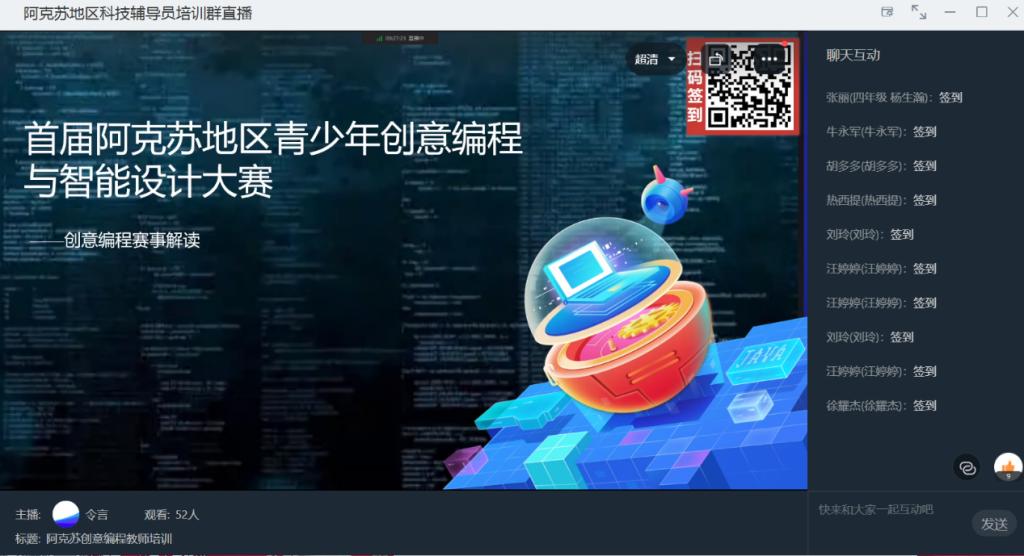 為深入貫徹《全民科學(xué)素質(zhì)行動(dòng)計(jì)劃綱要實(shí)施方案(2021-2035年)》和《新疆維吾爾自治區(qū)科學(xué)技術(shù)協(xié)會(huì)事業(yè)發(fā)展“十四五”規(guī)劃(2021-2025年)》中,“加強(qiáng)青少年科技輔導(dǎo)員能力建設(shè)”的有關(guān)要求,落實(shí)《國(guó)務(wù)院關(guān)于印發(fā)新一代人工智能發(fā)展規(guī)劃的通知》精神,阿克蘇地區(qū)科協(xié)、阿克蘇市科協(xié)、阿克蘇市新時(shí)代青少年科學(xué)院于9月20日舉辦首屆阿克蘇地區(qū)青少年創(chuàng)意編程與智能設(shè)計(jì)大賽。大賽通過(guò)線上方式舉辦,面向全市各學(xué)校科技輔導(dǎo)員,共有52名科技輔導(dǎo)員教師參加培訓(xùn)。