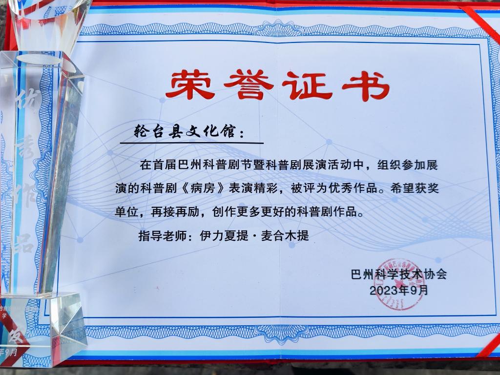 近日,巴州科學(xué)技術(shù)協(xié)會(huì)公布“首屆巴州科普劇節(jié)暨科普劇展演活動(dòng)”獲獎(jiǎng)單位,輪臺(tái)縣文化館創(chuàng)作的科普劇《病房》經(jīng)專家評(píng)審和復(fù)核,入圍大眾類科普作品現(xiàn)場(chǎng)決賽,評(píng)為優(yōu)秀作品,并代表全州八縣一市獲獎(jiǎng)單位,在“首屆巴州科普劇節(jié)暨科普劇展演活動(dòng)”頒獎(jiǎng)典禮上表態(tài)發(fā)言。