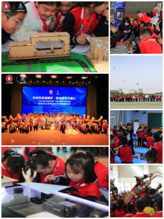 精彩的無人機編隊表演正式拉開科技節(jié)的帷幕。本屆科技節(jié)活動精彩紛呈、形式多樣,內(nèi)容豐富有趣、科技感強,分為上午科技節(jié)開幕式表演及科技互動體驗項目和下午進班級科普活動及科普講座兩部分進行。開幕式還展示了科技老師們帶來的科學(xué)秀表演《穿越之奇幻科技節(jié)》、海淀學(xué)生的經(jīng)典誦讀《中國傳統(tǒng)節(jié)日》。科技互動體驗項目包含海淀小學(xué)科技社團的學(xué)生科技創(chuàng)作區(qū)及科技節(jié)機器人互動體驗區(qū):足球機器人對抗、無人駕駛機器人、動感小車表演;科技創(chuàng)新體驗區(qū):激光雕刻機、金屬機器人DIY、車輛駕駛體驗、無土栽培柜等展示;航空航天科技展區(qū)車模遙控表演;人工智能展區(qū):智能機械臂;元宇宙展區(qū):VR虛擬場景愛國主義教育、VR體感射擊體驗天宮空間站、航天AI感知交互體驗。異彩繽紛的科技體驗項目,科技感滿滿的科技儀器,創(chuàng)新有趣的科技作品,極具美感的美猴王、黑熊的科技舞蹈。給孩子們帶來了一場饕餮盛宴,讓好奇與童真、智慧與科技碰撞出絢麗的火花。